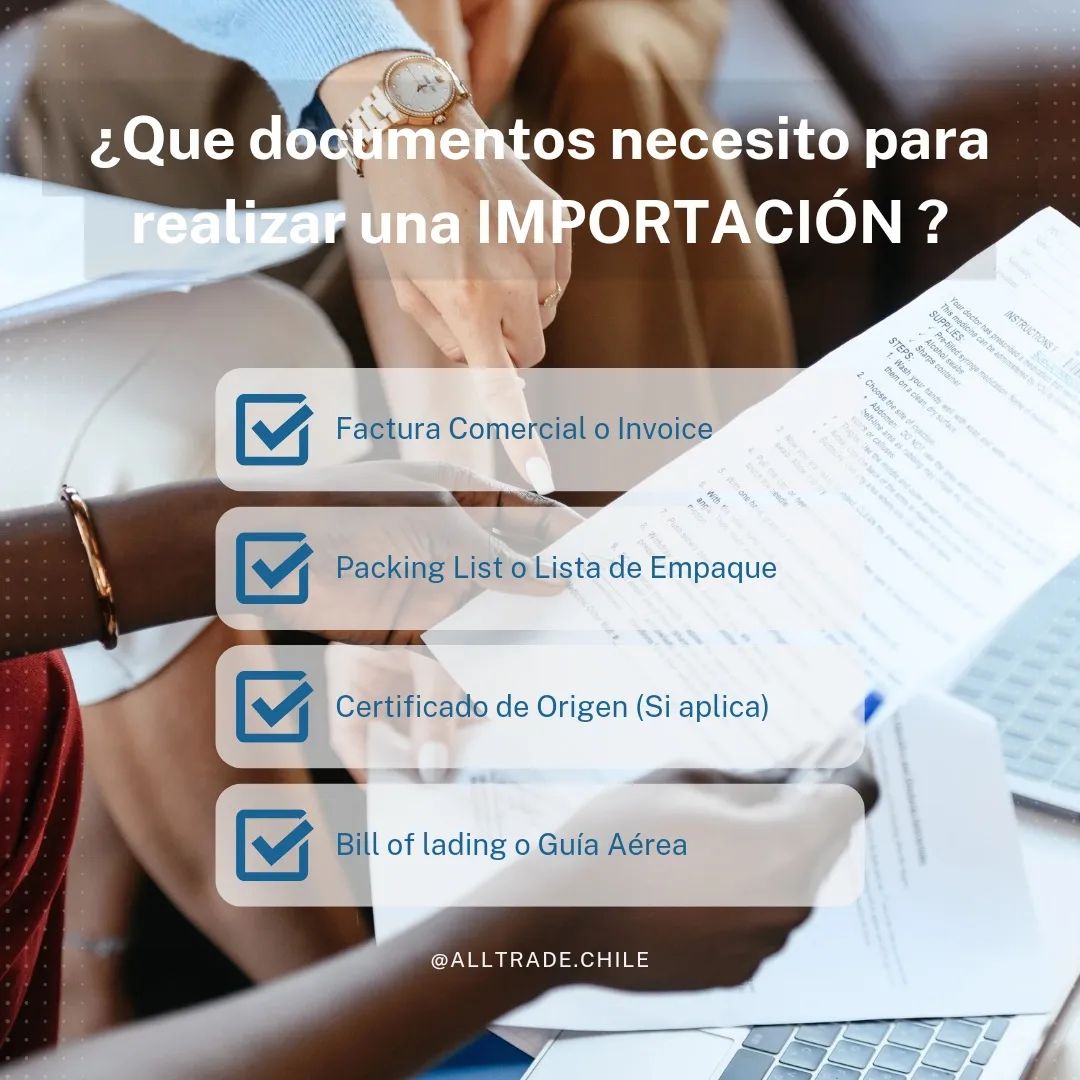 Conocimiento de embarque - Factura comercial original-Declaración de Ingreso (DIN)-Certificado de Origen , en caso que la importación se acoja a alguna preferencia arancelaria, en virtud de un Acuerdo Comercial.-Lista de empaque-Certificado de seguros, cuando el valor de la prima no se encuentre consignado en la factura comercial.-Permisos, visaciones, certificaciones o vistos buenos, cuando proceda